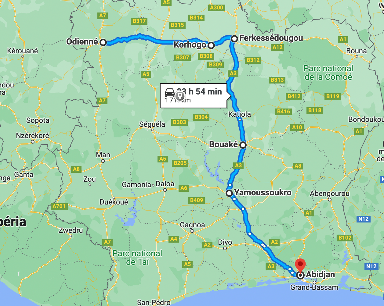 Direction donc Korhogo. La voie directe étant en mauvais état, je vous recommande très fortement de faire le détour par Ferkéssedougou. Vous en aurez pour environ 1 h de plus (selon Google Maps) mais la voie est clean et vous pourrez conduire tranquillement tout du long.