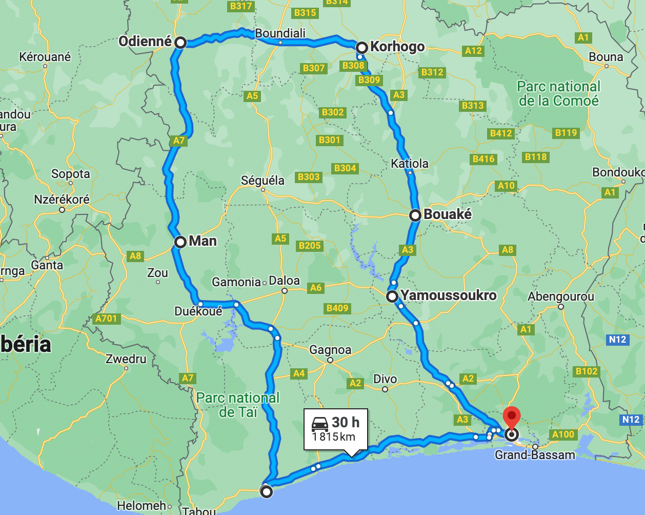 Initialement, j’avais prévu de débuté par le nord en passant par Yamoussoukro, Bouaké, Korhogo et Odienné puis de redescendre par Man, mais l’état de la route entre Odienné et Man étant en mauvais état (et la fatigue aidant), je me suis contenté de la première étape avant de redescendre sur Abidjan.